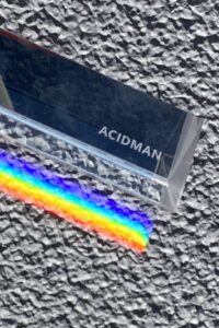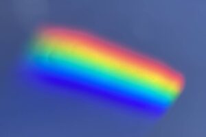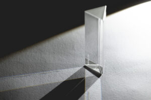 プリズムが特定の位置で光を受けると、光の波長の角度が変わり鮮やかな虹色が現れます。