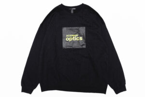 フロントにOpticsのボックスロゴを配した蛍光プリントが目を惹く一品。